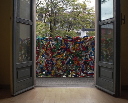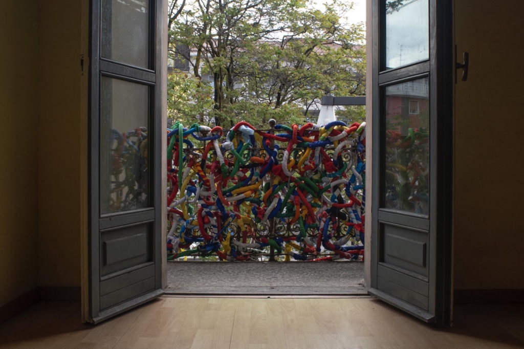 Inviluppo di connessioni, lussureggiante, debordante, proliferante come un arabesco vegetale, slancio vitale autogeno come una fusione di colori, come una improvvisa sincronia di preziose intenzioni. Una consapevolezza intessuta in una scultura vivente di relazioni. Un delicato medium materico in grado di accogliere, proteggere, custodire. La qualità non effimera della verità appartiene alla levità di forme innocue inadatte a nuocere, ricche di sensibilità, mobili e agili, capaci di creare mondi vulnerabili, ma indistruttibili. Apparizioni quasi involontarie che lasciano intravedere infiltrazioni di verità tra macerie di stoffe avviluppate. Una parete che vibra di strisce sensibili orientate da un intreccio di impulsi annodata su filamenti di memorie intrecciate in una tessitura di significati che prova ad ri-annodare rapporti umani sfilacciati.